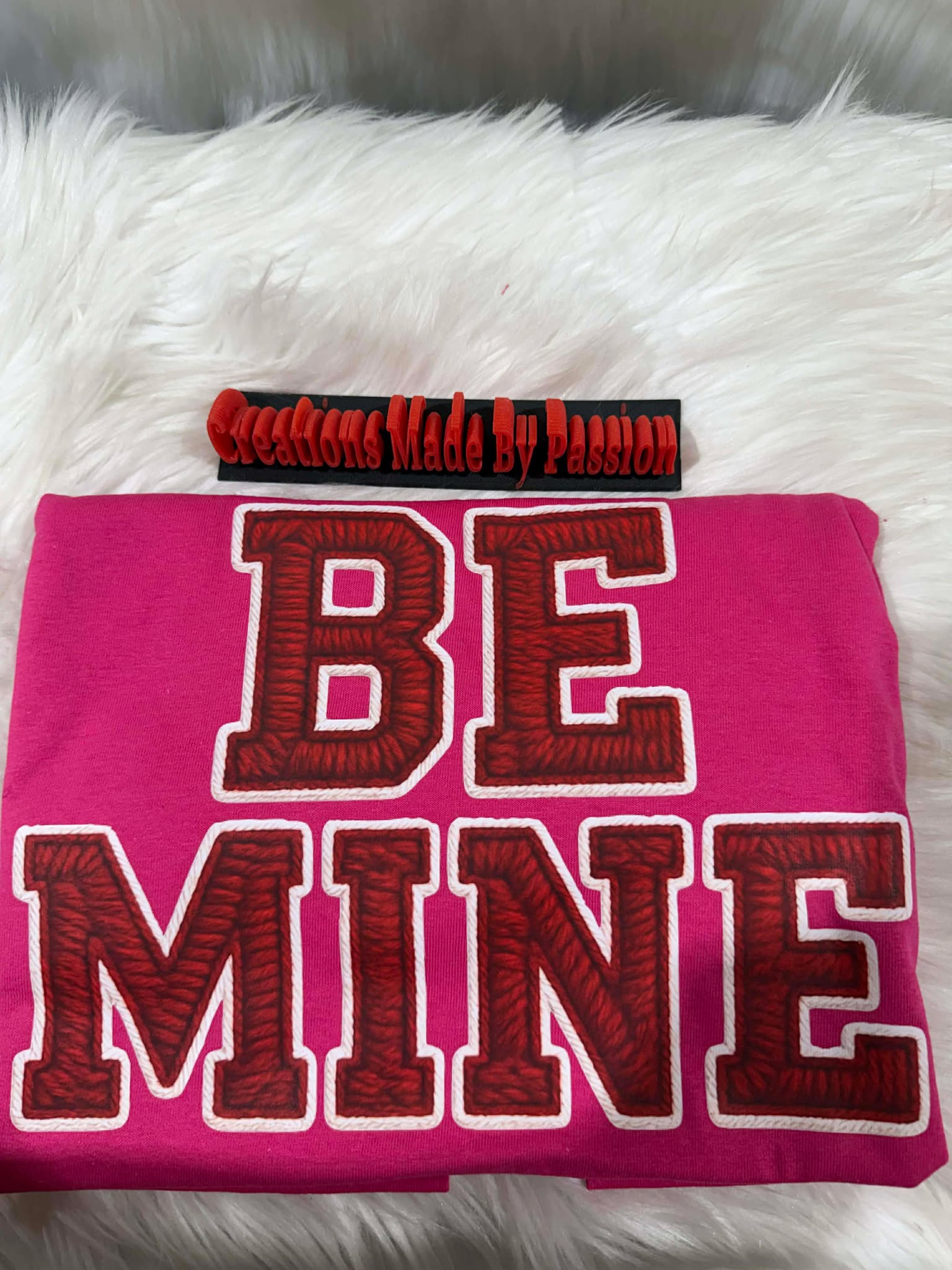 Bold “Be Mine” graphic with stitched-look texture
