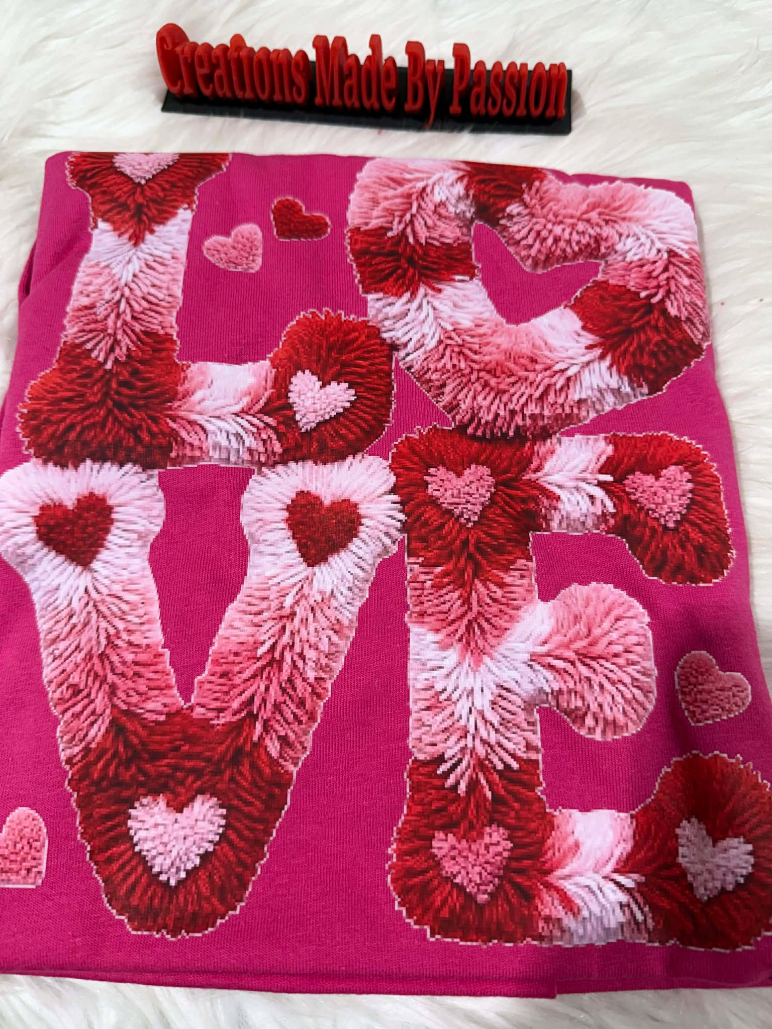 Fall in love with this bold and cozy “LOVE” Valentine crewneck, featuring a unique plush-style heart typography design. The letters are filled with textured red and pink heart details, giving a soft, fluffy 3D look that really pops against the vibrant pink background. Perfect for Valentine’s Day, date nights, or spreading love all year long.